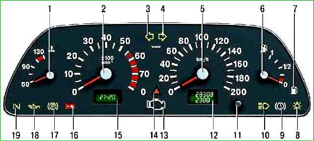 1 - Kühlmitteltemperaturanzeige im Motorkühlsystem; 2 - elektronischer Drehzahlmesser zeigt die Motordrehzahl an; 3 - die Kontrollleuchte zum Einschalten des linken Blinkers (mit grünem Filter in Form eines Pfeils) leuchtet blinkend auf, wenn der linke Blinker synchron dazu eingeschaltet wird; 4 - Kontrollleuchte zum Einschalten des rechten Blinkers (siehe Punkt 3); 5 - Tachometer vom Induktionstyp zeigt an, wie schnell sich das Auto gerade bewegt; 6 - Kraftstoffstandanzeige des elektromagnetischen Funktionsprinzips; 7 - Kontrollleuchte für die minimale Kraftstoffreserve im Tank (mit orangefarbenem Filter); 8 - Kontrollleuchte zum Einschalten des Standlichts (mit grünem Filter); 9 - Warnleuchte für den Notzustand des Bremssystems (mit rotem Filter); 10 - Kontrollleuchte zum Einschalten des Fernlichts (mit blauem Filter); 11 - Taste zum Zurücksetzen des Tageskilometerzählers, Umschalten der Uhrzeit- und Umgebungstemperaturanzeige und Einstellen der Uhrzeit; 12 - elektronische Kilometeranzeige; Die obere Zeile des Indikators zeigt die Gesamtkilometerleistung des Fahrzeugs an, die untere Zeile zeigt die tägliche Kilometerleistung an. 13 - Kontrollleuchte des Motormanagementsystems (mit orangefarbenem Filter) „CHECK ENGINE“; 14 - Warnlampe zum Einschalten des Alarms (mit Rotlichtfilter); Leuchtet mit blinkendem Licht, wenn die Warnblinkanlage eingeschaltet ist; 15 - Zeit- und Temperaturanzeige; 16 - Warnleuchte für Batterieentladung (mit rotem Filter); 17 - Kontrollleuchte zum Einschalten der Feststellbremse (mit rotem Filter); 18 - Warnlampe für Notabfall des Öldrucks (mit rotem Filter); 19 – reservieren
