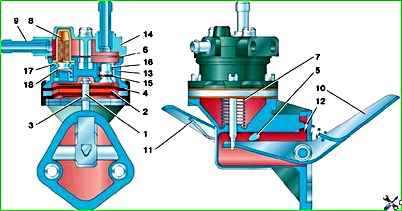 Um die „Universal“-Pumpe zu zerlegen (siehe Abb. 2), lösen Sie die Schrauben, mit denen die Abdeckung 14 befestigt ist, und entfernen Sie die Abdeckung und das Filterelement 8