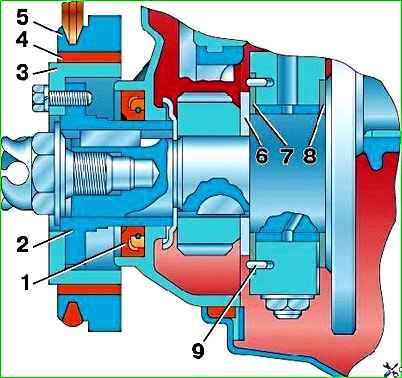 Wenn das Axialspiel mehr als 0,175 mm beträgt, ersetzen Sie die Unterlegscheiben 7 (Abb. 2) und 8 durch neue.