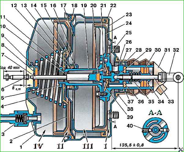 Stellen Sie vor der Montage des Hauptbremszylinders am Bremskraftverstärker die Verlängerung der Stange 7 relativ zur Passebene des Deckels 1 auf 7,78–8 mm und die Verlängerung des Drückers 33 relativ zur Passebene des Gehäuses 23 ein bis 134,7–136,3 mm.