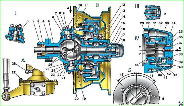 Abb. 1. Achsschenkel: a - Signalnut; b – Zeiger; I – rechter Achsschenkel; II – linker Achsschenkel; III - Radfreigabekupplung; IV – Radfreigabekupplung (optional); c – Räder sind deaktiviert; d – Räder sind an; 1 - Achsschenkelhebel; 2 - Achsgehäuse; 3 - Öldichtung; 4, 20 - Dichtungen; 5 - Kugelgelenk; 6 - Achsschenkelkörper; 7 - Stützscheibe; 8 - Überlagerung; 9 - Achsschenkelbolzen; 10 - Schmiernippel; 11 - Sicherungsstift; 12 - Achse; 13 - Radnabe; 14 - Vorderflansch; 15 - Kupplung: 16 - Kupplungsbolzen; 17 - Sperrkugel; 18 - Schutzkappe; 19 - Stiftbuchse; 21 – innerer Ring; 22 - Trennring; 23 - Außenring; 24 - Gummidichtring; 25 - Filzdichtring; 26 - Anlaufscheiben; 27 - Drehbegrenzungsbolzen; 28 - Raddrehbegrenzer; 29 - Ring; 30 - Antriebskeilbuchse; 31 - Verbindungskeilbuchse; 32 - Antriebsbuchse; 33 - Kappe; 34 - Bezug: 35 - Manschette; 36 - Stift; 37 - Schalter; 38 - Kugel; 39,41 - Federn; 40 - Dichtung; 42 - angetriebene Buchse; 43 - Zugfeder; 44 - Körper; 45 - Sicherungsring