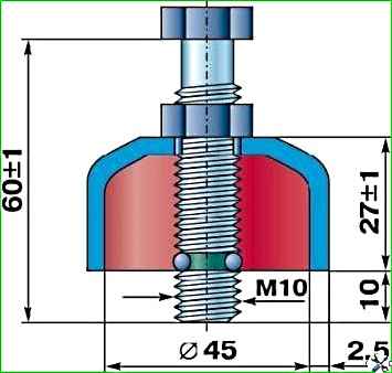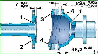 Das Maß von der Ebene der Anlaufscheibe 1 (Abb. 7) bis zum Flansch des Zapfens 2 sollte 7 +0,08 –0,26 mm, von der Ebene der Unterlegscheibe 1 bis zur Mitte des Kugelgelenks 3 – 48,2 +0,38 mm.