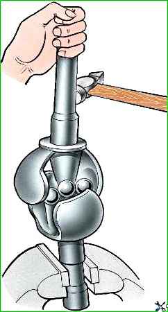 Wenn die gegenüberliegende Kugel nicht aus den Rillen kommt, drücken oder schlagen Sie mit einem Kupferhammer auf die kurze Faust (Abb. 6).