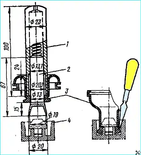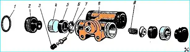 Entfernen Sie bei der Demontage des Radzylinders die Federn der Kappen 1 (Abb. 3) und der Kappen 2, zusammengebaut mit den Kolben 4.