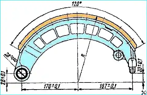 Reparaturmaße - Innendurchmesser der Bremstrommel, mm - Außendurchmesser der Beläge auf den Belägen 2R mm: