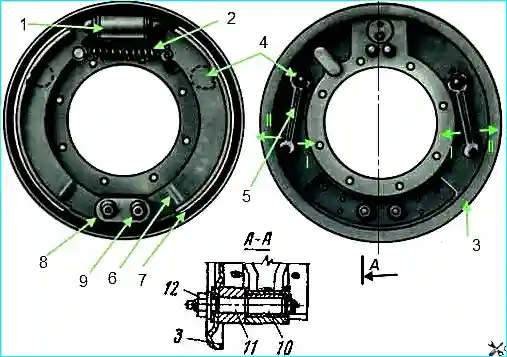 Wenn die Belagbeläge oder Belagbaugruppen nicht ausgetauscht werden können, wird das Lösen der Muttern 12 und das Drehen der Achsen 11 in der Schildhalterung nicht empfohlen, da die Beläge bei der Montage ihre vorherige Position relativ zur Bremstrommel einnehmen könnten. und erleichtert somit die Einstellung der Abstände zwischen Belagbelag und Bremstrommel.