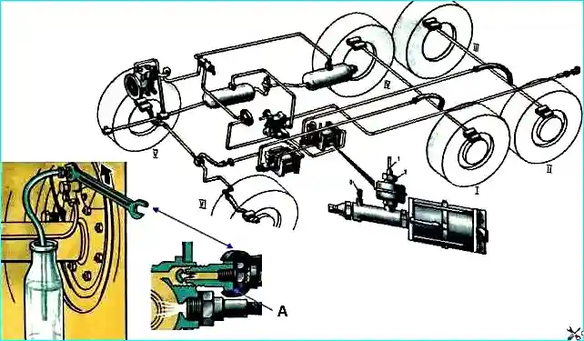 Nachdem Sie die Bremsen aller Räder eingestellt haben, montieren Sie die Achswellen und entlüften (füllen) Sie das Hydrauliksystem mit Bremsflüssigkeit, nachdem Sie zuvor die Außenflächen der Hauptbremszylinder, Bremsflüssigkeitsbehälter und Bypassventile gründlich von Schmutz befreit haben.
