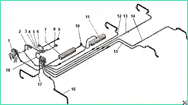 Das Reifendruckregelsystem besteht aus einem Druckregelventil, einem Zwischenzylinder-Reduzierstück, einem Block von Reifenventilen, einem Block von Luftzufuhrdichtungen im Achsgehäuse, Radventilen und Rohrleitungen