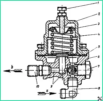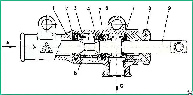 Wenn der Luftdruck im ersten (vorderen) Zylinder mehr als 5 kg/cm² erreicht, öffnet sich Ventil 5 und Luft tritt durch das Kniestück 8, die Kanäle 9 und das Anschlussstück 10 in den zweiten Zylinder ein
