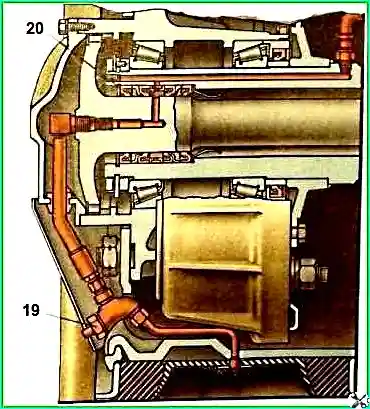 Zwei mittlere Öldichtungen sorgen für eine dichte Verbindung zwischen den Kanälen der festen Achse und den Kanälen der rotierenden Achse