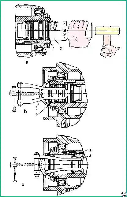 Entfernen Sie die Manschetten mit einem speziellen Abzieher (Position b und c), der im Werkzeugsatz enthalten ist.