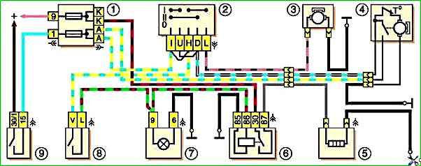 Schema zum Einschalten des Reinigers, der Waschanlage und des Heizelements der Heckklappenscheibe 1 - Sicherungsblock: 2 - Schalter für den Scheibenwischer und die Waschanlage der Heckklappe: 3 - Elektromotor der Heckklappenscheibenwaschanlage: 4 - Elektromotor des Heckklappenglasreinigers: 5 - beheiztes Heckklappenglaselement: 6 - Relais zum Einschalten des beheizten Heckklappenglases; 7 - Kontrollleuchte für beheizte Hintertürscheibe: 8 - Schalter für beheizte Hintertürscheibe: 9 - Zündschalter