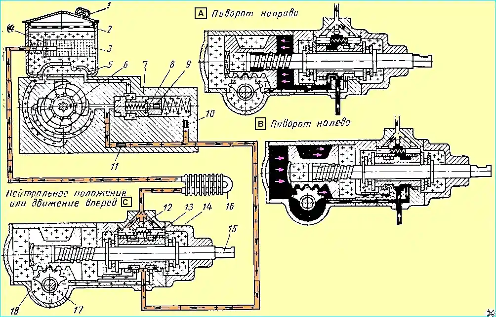 Je größer der Widerstand gegen das Drehen der Räder und je höher der Druck im Arbeitsraum des Zylinders, desto größer ist die Kraft, mit der das Ventil dazu neigt, in die Mittelstellung zurückzukehren und die Axialkugellager und die Schraube in die Mittelstellung zu bringen. Position, desto größer ist die Kraft am Lenkrad.