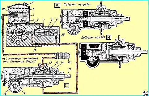 Das von der Pumpe in den Zylinder gelangende Öl drückt auf die Zahnstange des Kolbens, wodurch zusätzliche Kraft auf den Achsschenkelwellensektor ausgeübt wird und die Räder gedreht werden können.