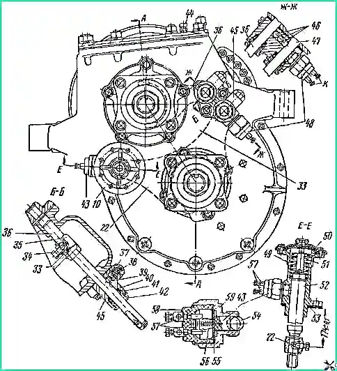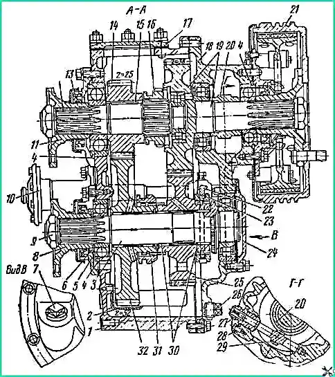 Abb. 2. Verteilergetriebe eines ZIL-131-Autos: 1 - Kurbelgehäuse; 2 - Tablett; 3 - Antriebswelle der Vorderachse; 4 - Sicherungsring; 5, 24 - Abdeckungen; 6 - Ölabweiserring; 7 - Einfüllstopfen; 8, 11 - Flansche; 9 - Flanschmutter; 10 - Luftmembrankammer zum Einschalten des Vorderachsantriebs; 12 - Antriebswelle; 13 - Öldichtung; 14 - Antriebsrad; 15 - Schlüssel; 16 - Schaltschlitten für den zweiten Gang; 17 - Lukendeckel; 18 - seitlicher Kurbelgehäusedeckel; 19 - angetriebene Welle mit Zahnrad; 20 - Tachoschnecke; 21 - Handbremstrommel; 22 - Vorderachsantriebsgabel; 23 - Schlitten zum Einschalten des Vorderachsantriebs; 25 - zweiter Gang; 26 - Ablassschraube; 27 - Tachometeranschluss; 28 - Sicherungsplatte; 29 - Tachometer-Antriebsrad; 30 - Nadellager; 31 - erster Gangschaltschlitten; 32 - erster Gang; 33 - erste Ganggabel; 34 - Verriegelungsbolzen; 35 - zweite Ganggabel; 36 – Einrückstange für den zweiten Gang; 37 - Haltefederstopfen; 38 - Frühling; 39 - Sperrkugel; 40 - Gummiring; 41- Filzring; 42 - Öldichtungsmutter; 43 - Schalter für die Warnleuchte, die anzeigt, dass die Vorderachse eingeschaltet ist; 44 - Verschnaufpause; 45 - Klemmengehäuse; 46 - Kugeln des Verriegelungsmechanismus; 47 - Einrückstange für den ersten Gang; 48 - Schalter des Elektromagneten des elektropneumatischen Ventils; 49 - Luftmembrankammergehäuse; 60 und 65 - Membranen; 51 - Rückholfeder; 52 – Stab