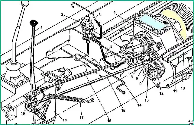 Verteilergetriebe-Steuerantrieb des ZIL-131-Autos: 1 - Gangschalthebel; 2 - elektropneumatisches Ventil; 3 - Entlüftungsrohr; 4 - Verteilergetriebe; 5 - Luftzufuhrschlauch zur Luftmembrankammer; 6 - Traktionsgabel; 7 - Luftmembrankammer; 8 - Kontermutter; 9 - Flansch der Vorderachsantriebswelle; 10 - Längsträger; 11 - Befestigungsschraube des Verteilergetriebes; 12 - Einrückstange für den ersten Gang; 13 – Einrückstange für den zweiten Gang; 14 - Luftzufuhrrohr zum elektropneumatischen Ventil; 15 - Einrückstange für den ersten Gang; 16 – Einrückstange für den zweiten Gang; 17 - Zugfeder; 18 - Getriebe; 19 – Hebelohrring