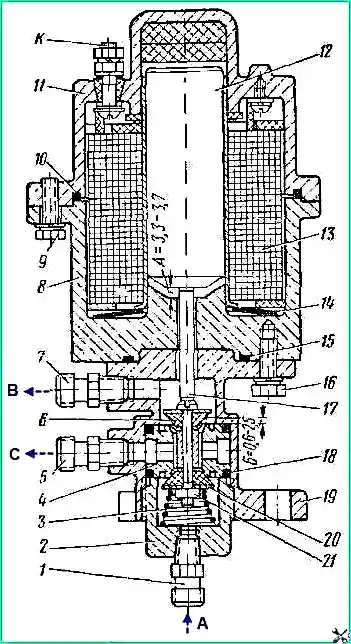 Elektropneumatisches Ventil: 1, 5, 7 – Armaturen; 2 – Stecker; 3 – Ventilfeder; 4 – Ventilsitz; 6 – Auslassventil; 8 – Gehäuse des Elektromagneten; 9, 16 – Bolzen; 10, 15, 18 – Dichtungsringe; 11 – Abdeckung; 12 – Kern; 13 – Elektromagnetwicklung; 14 – Distanzscheibe; 17 – Stab; 19 – Körper; 20 – Einlassventil; 21 – Nuss; B - zur Verschnaufpause; C - zur Luftmembrankammer; A - vom Bremsventil