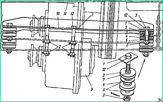 Aufhängung des Verteilergetriebes: 1, 5, 8 – Unterlegscheiben; 2 – Nüsse; 3, 4 – Kissen; 6 – Haarnadel; 7 – Distanzhülse; 9 – Verteilergetriebe; 10 – Balken für Befestigungsabschnitt Schleifkasten; 11 – Rahmen; 12 - Schrauben