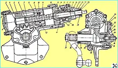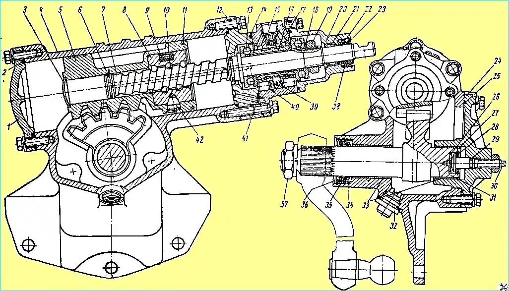 Lenkmechanismus: 1 - untere Abdeckung; 2, 14, 25, 29 und 41 - O-Ringe; 3 - Stecker; 4 - Lenkgetriebegehäuse; 5 - Kolbenstange; 6 - Dichtungsspaltring; 7 - Lenkschraube; 8 - Kugelmutter; 9 - Rinne; 10 - Ball; 11 - geteilte Kolbenringe; 12 - Zwischenabdeckung; 13 - Axialkugellager; 15 - Kugelhahn; 15 - Ventil; 17 - Steuerventilkörper; 18 - Federscheibe; 19 - Einstellmutter; 20 - obere Abdeckung; 21 - Nadellager 22 und 35 - Öldichtungs-Anlaufringe; 23 - äußere Dichtmanschette; 24 - Seitenabdeckung; 26 - Anlaufscheibe; 27 - Einstellscheibe; 28 - Sicherungsring; 30 - Einstellschraube; 31 - Zweibeinschaft; 32 - Ablassschraube mit Magnet; 33 - Achsschenkelwellenbuchsen; 34 und 38 - Öldichtungen; 36 - Gummimanschette; 37 - Lenkstockhebelwellenmutter; 39 - Reaktionsfeder; 40 - Strahlkolben; 42 - Stellschraube