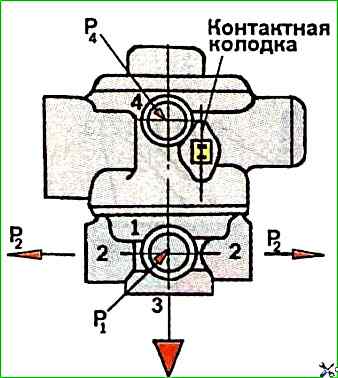 Die Überprüfung der Ventildichtheit erfolgt in zwei Positionen: wenn am Auslass 1 ein Druck von 0,75 MPa herrscht; bei einem Druck von 0,75 MPa in den Anschlüssen 1 und 4.