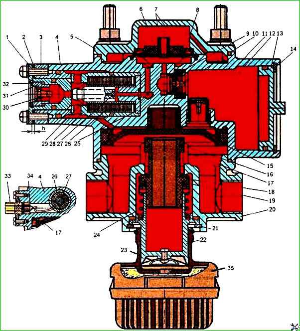 Um den Elektromagneten zu demontieren, müssen Sie zuerst die Schrauben lösen, mit denen der Steckerblock befestigt ist, die Drähte 34 ablöten und die Elektromagnetbaugruppe aus Gehäuse 4 entfernen.