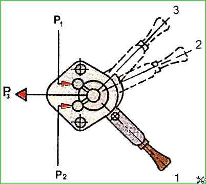 Um das Ventil auf Undichtigkeiten zu prüfen, ist es notwendig, Luft unter einem Druck von 0,75 MPa an Klemme I an den Griffpositionen 1 und 3 zuzuführen.