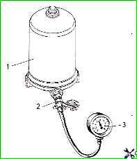 Die Diagnose des Zustands und der Leistung von pneumatischen Antriebsgeräten kann anhand der Messwerte eines Kontrollmanometers ermittelt werden, das an die am Fahrzeug installierten Steuerklemmen angeschlossen ist (Abb. 1).