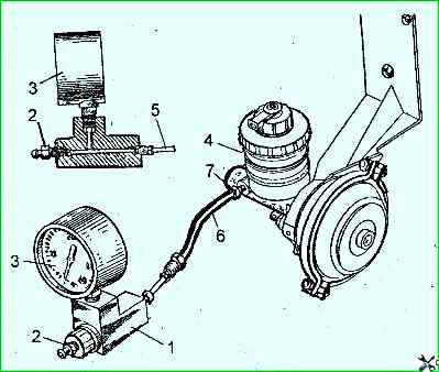 Prüfung des Hauptbremszylinders. Die Leistung des Hauptbremszylinders kann an einem Auto mit einem speziellen Gerät ermittelt werden, das in Abb. 4.