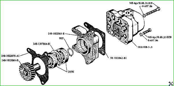 Teile der Servolenkungspumpe für das Auto ZIL-5301 gemäß Katalog: 205K-Lager; 240-1022030-02 Hydraulikpumpen-Antriebsbaugruppe; 240-1022061-B Getriebe; 240-1022069 Wohnen; 240-1022075-A1 Dichtung; 240-1307064-01 Ring; 50-1022062-B1 Dichtung; 8.65G.06 Unterlegscheibe; B25-Ring; М8-6gх30.88.35.019 Bolzen; М8-6gх70.88.35.019 Bolzen; NSh10V-3-L Zahnradpumpe