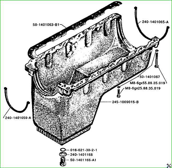 Teile der Dieselölwanne D-245 laut Ersatzteilkatalog: 016-021-30-2-1 – Ring; 240-1401059-A – Vordere Öldichtung; 240-1401065-A Öldichtung; 240-1401168 Unterlegscheibe; 245-1009015-B Ölkurbelgehäuse; 245-1009015-B Ölkurbelgehäuse; 50-1401063-B1 Dichtung; 50-1401067 Unterlegscheibe; 50-1401166-A1 Stopper; М8-6gх25.88.35.019 Bolzen; М8-6gх55.88.35.019 Bolzen