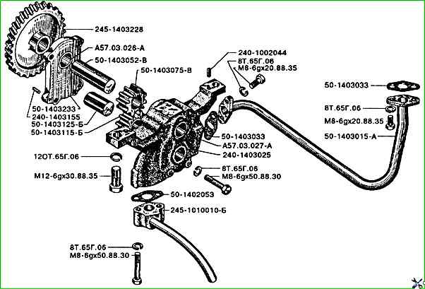 Teile der Ölpumpe D-245 laut Katalog: 120T.65G.06 Unterlegscheibe; 240-1002044 Stift; 240-1403020 Gehäuse mit Buchsenbaugruppe; 240-1403025 Wohnen; 240-1403150 Abdeckung mit Buchsenbaugruppe; 240-1403155 Abdeckung; 245-1010010-B Ölbehälter; 245-1403010 Ölpumpe; 245-1403228 Zahnrad; 50-1402053 Dichtung; 50-1403015-A Abzweigrohr; 50-1403033 Dichtung; 50-1403052-B Walze; 50-1403075-B Zahnrad; 50-1403115-B Zahnrad; 50-1403125-B Finger; 50-1403233 Stift; 8T.65G.06 Unterlegscheibe; A57.03.026-A Buchse; A57.03.027-A Buchse; A57.03.028-A Buchse; М12-6gх30.88.35 Bolzen; М8-6gх20.88.35 Bolzen; М8-6gх50.88.35 Bolzen