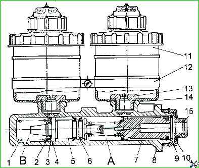 - - Positionieren Sie die GTZ mit den Tanks nach unten und entfernen Sie durch mehrmaliges Drücken des Kolbens der Primärkammer „A“ die restliche Bremsflüssigkeit aus dem Zylinder;