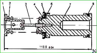 - - Primärkolben 7 gemäß Abb. zusammenbauen. 4 mit Feder 2 (bei Demontage), Einbau neuer Gummimanschetten 5 und 8: