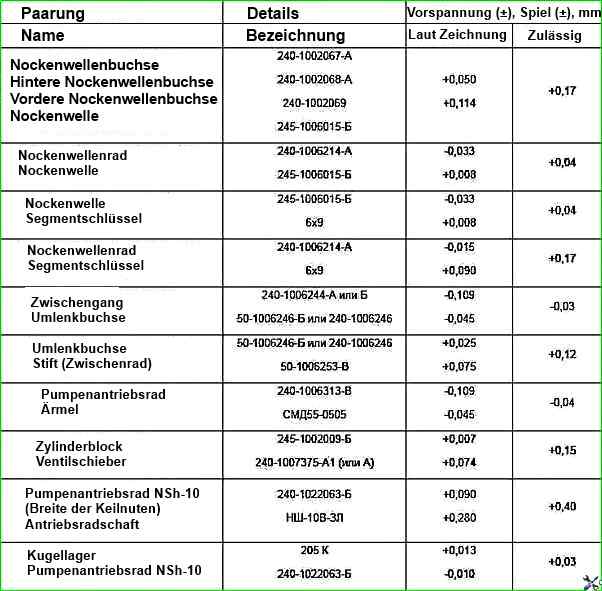 Der Spalt zwischen dem Ende des Zapfens der zusammengebauten Nockenwelle und dem Druckflansch (Axialspiel der Welle) darf 0,3–1,04 mm betragen (siehe Abb. 2).