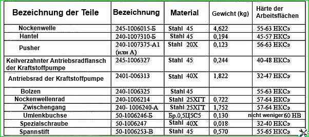 Anforderungen an Teile des Gasverteilungsmechanismus ZIL-5301