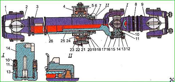 Kardanantrieb: 1 – Gabelflansch; 2 – Gabel; 3 – Zwischenkardanwelle; 4 – Stützkissen; 5 – Kissenhalterung; 6 – Mutter zur Befestigung des Zwischenstützlagers; 7, 18 – Siegel; 8 – Antriebswelle der Hinterachse; 9 – Kardanwellengabel; 10 – Gleitringdichtung; 11 – Einkantenmanschette mit Nadellager; 12 – Sicherungsblech; 13 – Nadellager des Querstücks; 14 – Querstrebe; 15 – Stützplatte; 16 – Bolzen; 17 – Gleitgabel; 19 – Öler zum Schmieren des Zwischenstützlagers; 20 – Klemme; 21 – Splint; 22 – Klemmschloss; 23 – Stützhalterung; 24 – Kugellager; 25 – Keilbuchse; 26 – Keilwellenbuchsenstopfen