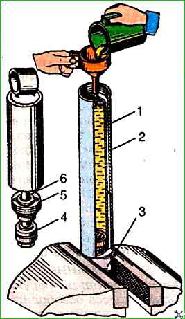 Arbeitszylinder 3 komplett mit Kompressionsventil 14 in den Behälter einbauen und den Arbeitszylinder mit der in der Tabelle angegebenen Menge der Flüssigkeit AZH12T TU 38101432-75 füllen, wie in Abb. 2.