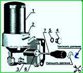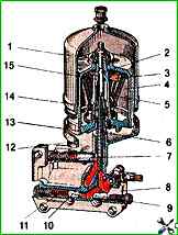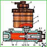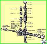 Die Hauptbremszylinder (MBC) sind durch zwei Schrauben zu einer Einheit mit pneumatischen Kammern, die pneumatische Verstärker sind, verbunden und auf Halterungen an der Frontplatte des Fahrerhauses unter der Motorhaube des Fahrzeugs montiert, um die Räder des Fahrzeugs zu bremsen der Vorderachse und hinter der Hinterachse für die Räder der Hinterachse