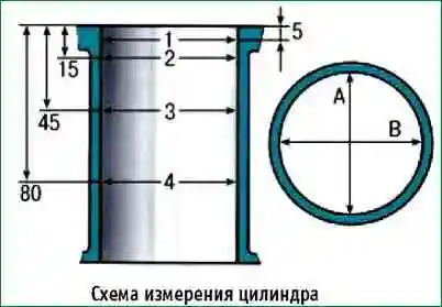 Измерьте диаметры цилиндра в двух перпендикулярных плоскостях (рис. 7) (В — вдоль, А — поперек блока цилиндров) и в четырех поясах (1, 2, 3 и 4).