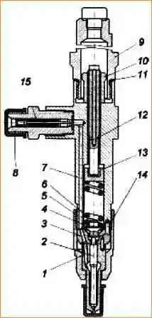 Форсунка: 1 - корпус распылителя; 2 - игла распылителя; 3 - проставка; 4 - штанга; 5 - гайка распылителя; 6 - пружина; 7 - корпус; 8 - штуцер с фильтром; 9 - колпак; 10 - гайка; 11 - шайба; 12 - регулировочный винт; 13 - тарелка пружины; 14 - штифт; 15 - щелевой фильтр