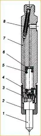 Форсунка: 1 - распылитель; 2 - гайка распылителя; 3 - проставка; 4 - штанга; 5 - пружина; 6 - регулировочные шайбы; 7 - корпус; 8 - щелевой фильтр