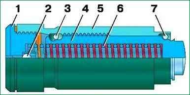 Гидронатяжитель цепи: 1 - резьбовая пробка; 2 - обратный шариковый клапан; 3 - запорное кольцо; 4 - плунжер; 5 - корпус; 6 - пружина; 7 - стопорное кольцо