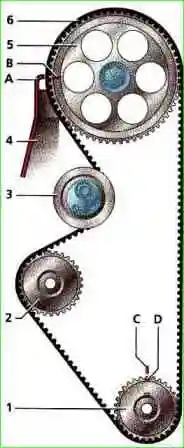 Схема привода ГРМ: 1 - зубчатый шкив коленчатого вала; 2 - зубчатый шкив насоса охлаждающей жидкости; 3 - натяжной ролик; 4 - задняя защитная крышка; 5 - зубчатый шкив распределительного вала; A - установочный выступ на задней защитной крышке; B - метка на шкиве распределительного вала; C - метка на крышке масляного насоса; D - метка на шкиве коленчатого вала