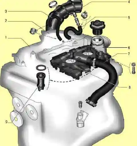 Система вентиляции картера закрытая, с отводом картерных газов через сепаратор 8 (рис. 3) маслоотделителя, установленного в крышке 6 головки блока цилиндров, во впускную трубу.