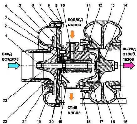 Турбокомпрессор: 1 - гайка крепления колеса компрессора; 2 - подшипник упорный; 3 - болт; 4 - корпус компрессора; 5 - вставка; 6 - крышка корпуса компрессора; 7 - кольцо уплотнительное; 8 - пластина компрессора; 9 - болт; 10 - болт-стопор; 11 - пластина турбины; 12 - корпус подшипника; 13 - проставка корпуса турбины; 14 - колесо турбины с валом; 15 - корпус турбины; 16 - кольца уплотнительные; 17 - втулка; 18 - болт; 19 - экран маслосбрасывающий; 20 - шайбы упорные; 21 - кольцо уплотнительное; 22 - винт; 23 - колесо компрессора