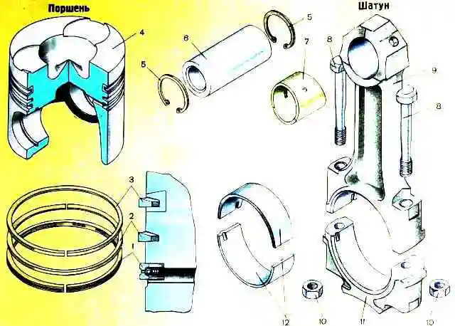 На крышке и шатуне со стороны короткого болта выбит порядковый номер цилиндра, а со стороны длинного болта выбиты метки спаренности в виде числа, одинакового для шатуна и крышки.