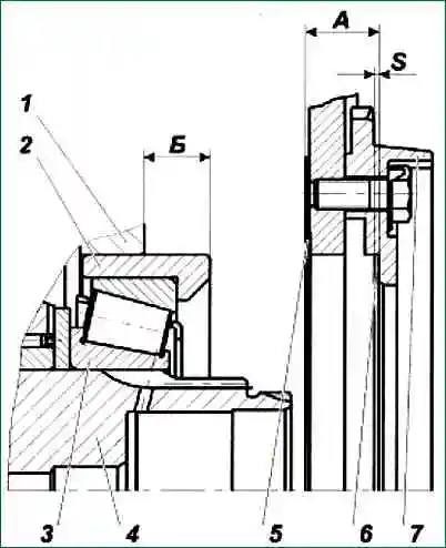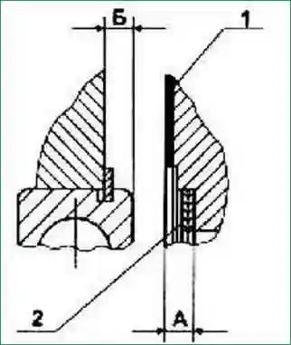 - 3.1. Замерить абсолютные величины размеров «А» (между торцами уплотнительной прокладки и проставки) и «Б» (между торцами картера и подшипника) рис. 5.