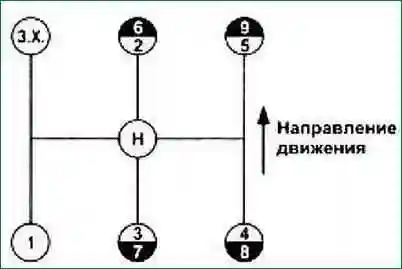 Переключение передач с первой по пятую и с шестой по девятую производить, как и на любой коробке передач, перемещением рычага переключения в соответствующее положение.