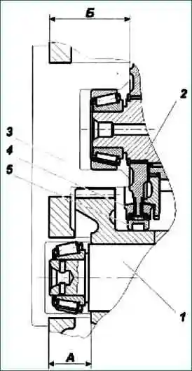 - 1.1. При запрессованном до упора внутреннем кольце переднего подшипника вторичного вала замерить размер «Б» (от торца ступицы синхронизатора до широкого торца наружного кольца подшипника).