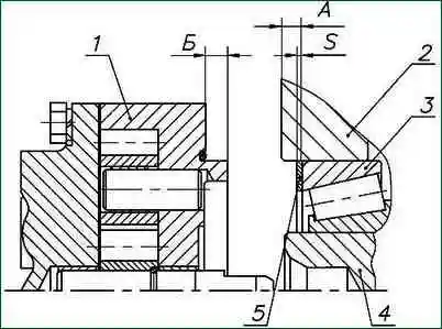 - 5.8. Подобрать необходимое количество регулировочных прокладок исходя из условия: Sпр= S-(0,005-0,05), где Sпр - суммарная толщина прокладок, а S=А-Б.
